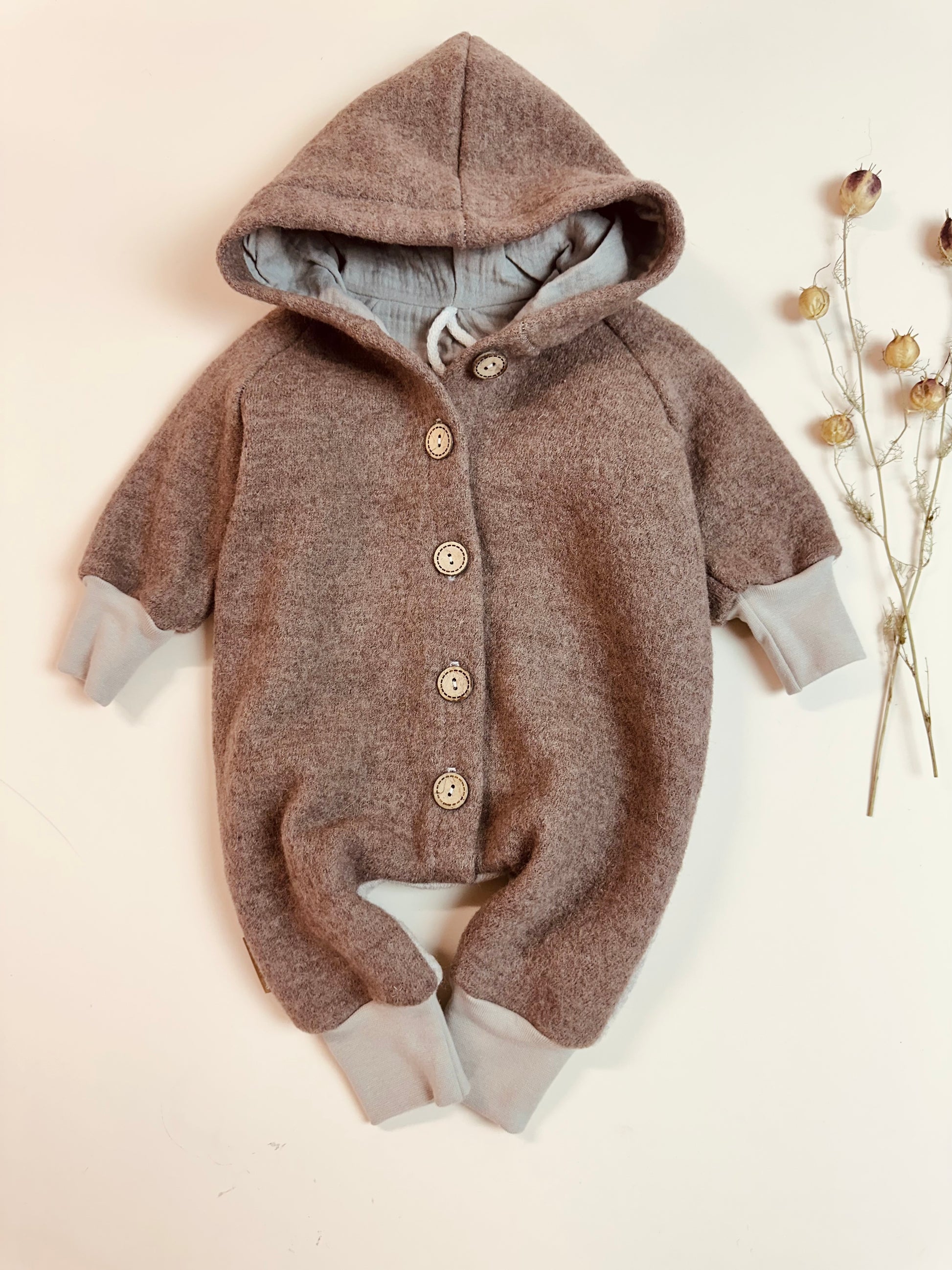 Schurwolle ist eines der besten Naturmaterialien – temperaturregulierend, wasserabweisend und schmutzabweisend. Sie hält angenehm warm, ohne zu überhitzen, und eignet sich perfekt für wechselnde Wetterbedingungen. Der Schmutz perlt einfach ab, und oft genügt es, den Overall an der Luft trocknen zu lassen. Für hartnäckige Flecken reicht Handwäsche in lauwarmem Wasser (20-25°C) mit Wollwaschmittel oder bei Bedarf etwas Gallseife – so bleibt der Overall lange schön.